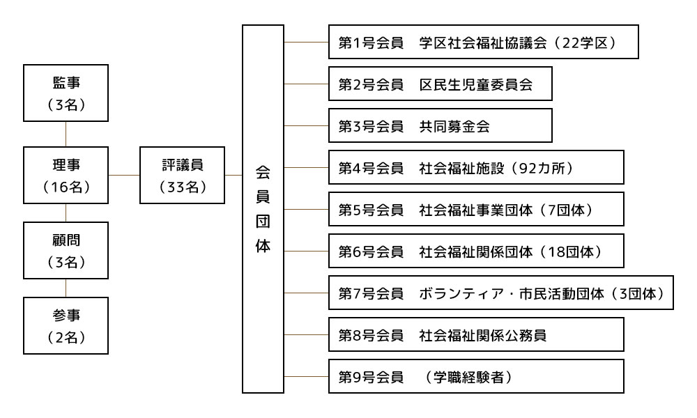京都市域では、住民の任意組織である学区社協、社会福祉法人格を持つ区社協、京都市社協の三層で構成されています。