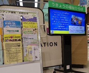 U-ネットでは平成28年度よりイオンモール京都五条と協力し、電子掲示板(デジタルサイネージ)を設置し、事業所の紹介やイベント告知などを行っています。