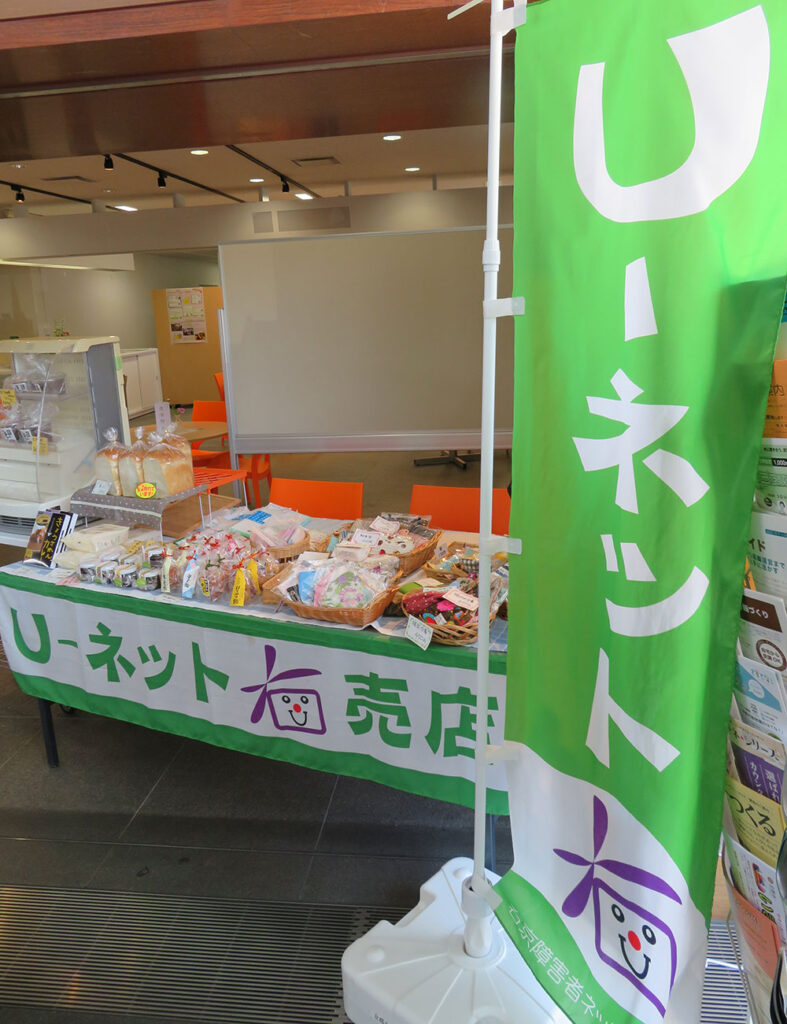 平成25年11月より、サンサ右京の協力により、区民交流まちづくり拠点のスペースをお借りし、様々な授産製品を販売、啓発する「U-ネット売店」を開催しています。